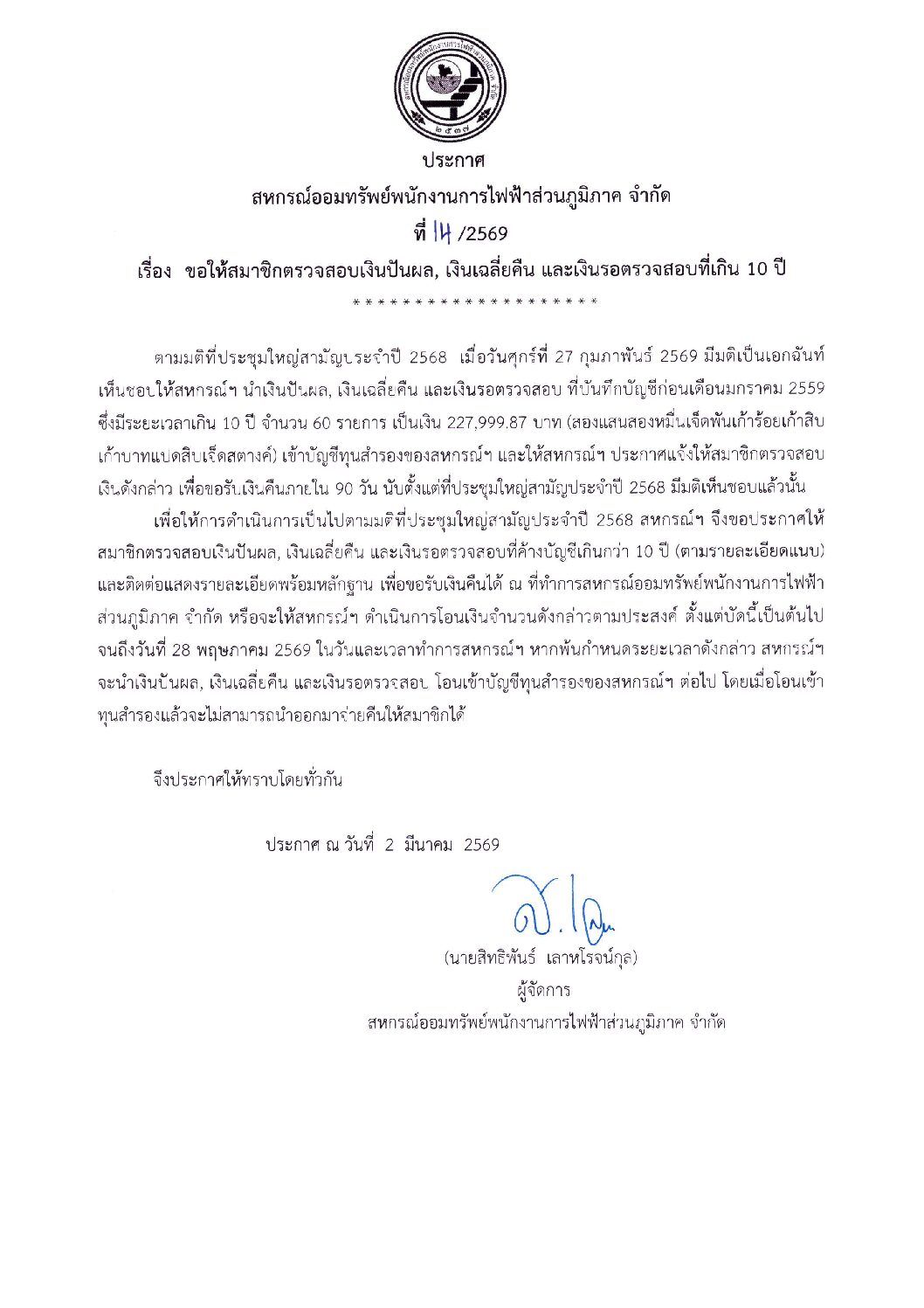 ให้สมาชิกตรวจสอบเงินปันผล เงินเฉลี่ยคืน และเงินรอตรวจสอบที่เกิน 10 ปี