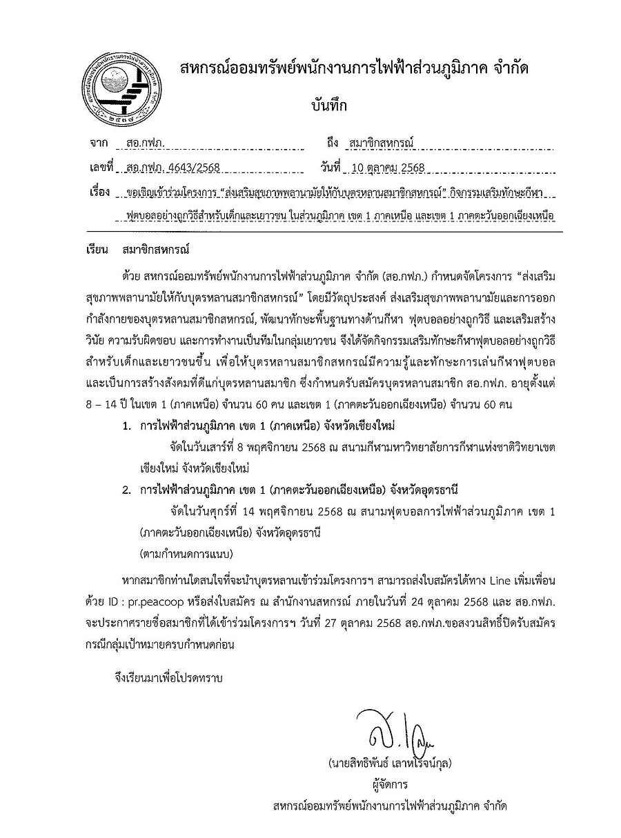 ขอเชิญเข้าร่วมโครงการ “ส่งเสริมสุขภาพพลานามัยให้กับบุตรหลานสมาชิกสหกรณ์” เขต กฟน.1, กฟฉ.1