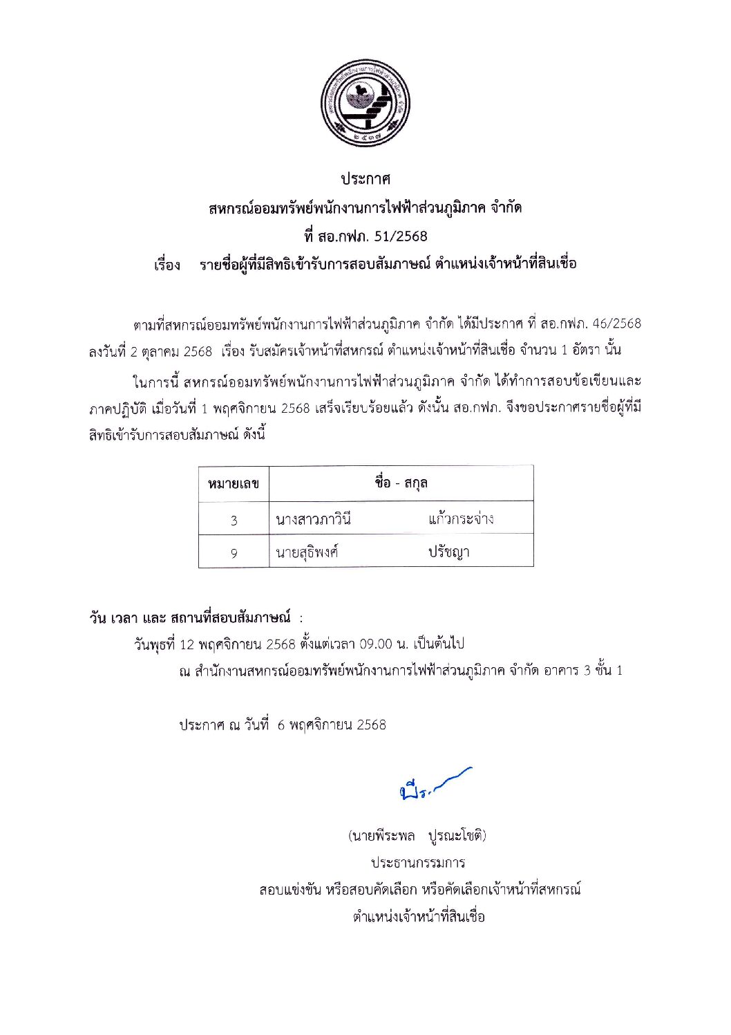รายชื่อผู้มีสิทธิเข้ารับการสอบสัมภาษณ์ ตำแหน่งเจ้าหน้าที่สินเชื่อ