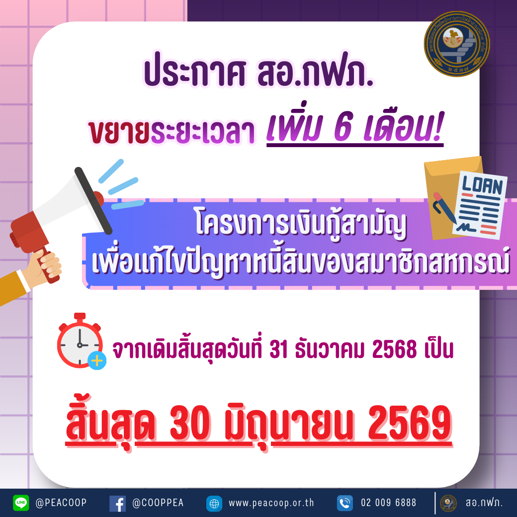 ขยายระยะเวลาการให้เงินกู้สามัญเพื่อการเฉพาะกิจ โครงการเงินกู้สามัญเพื่อแก้ไขปัญหาหนี้สินของสมาชิกสหกรณ์ พ.ศ 2567