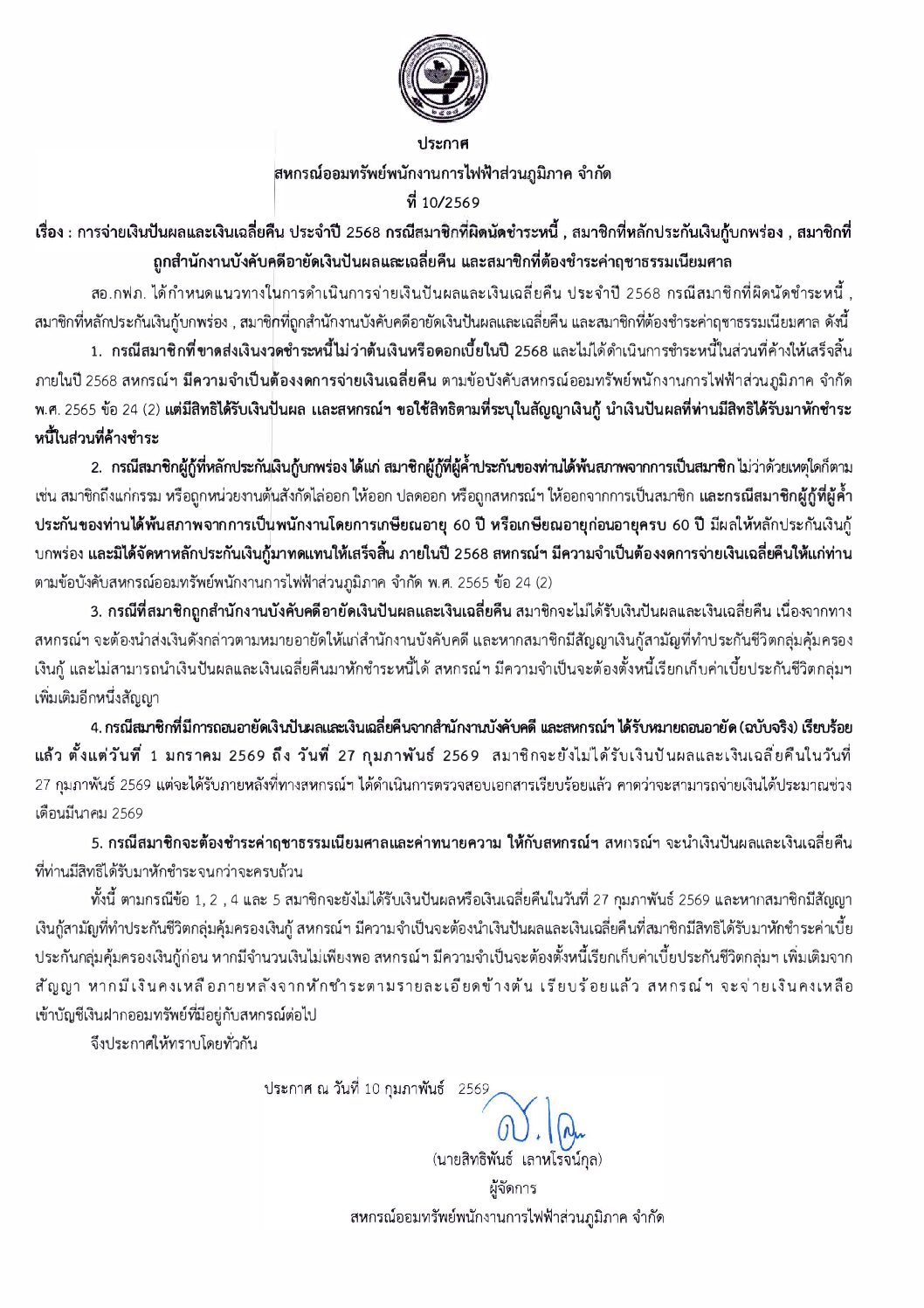 การจ่ายเงินปันผลและเงินเฉลี่ยคืน ประจำปี 2568 กรณีผิดนัดชำระหนี้ ฯลฯ