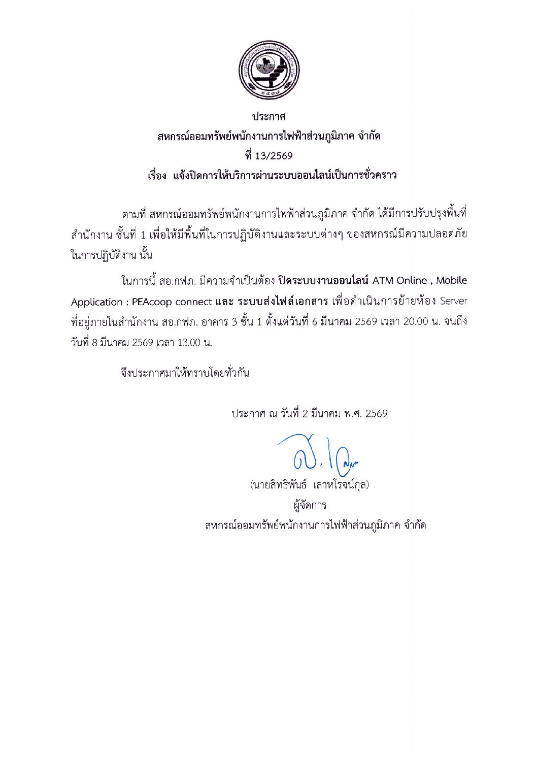 แจ้งปิดระบบการให้บริการผ่านระบบออนไลน์เป็นการชั่วคราว